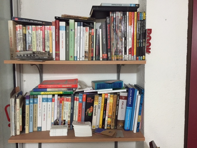 יש שם בעיקר ספרות מודרנית, ישראלית וזרה: הרבה עם עובד (מקיואן, שייבון, קובץ הסיפורים האחרון והנפלא של יהושע קנז), אבל לא רק: גם מורקמי, טושה גפלה וטרבאי, וכמה ספרים של "סמטאות". יש ספרי עיון שקראתי על ספרות פרסית מודרנית, וספרות פרסית שעוד לא קראתי (למרות שבקרוב צריך לבחור נושא לתזה). יש קרוב ל-20 ספרי קומיקס מהוצאת ורטיגו, כולל כמה גליונות של Fables בצרפתית שעזרו לי לתרגל את הקריאה. נמצא שם גם מילון הניבים של אריה גולן שקיבלתי במתנה, ולפעמים אני שולף אותו ומעיין בו כשביטוי כלשהו הביס אותי והמצח כבר מדמם מרוב תסכול. יש שם תהלים של קסוטו, שאין לי מושג למה או איך הוא הגיע לשם, וספר בשם 1000 Pin-up Girls שקיבלתי בתור בדיחה לפני שנים. הם לא עומדים אחד ליד השני, זה יהיה די נדוש. על הספרים שבמדף העליון שוכב גם "שחקן מספר אחת", ספר מתורגם שערכתי ומעט מאוד אנשים קראו.